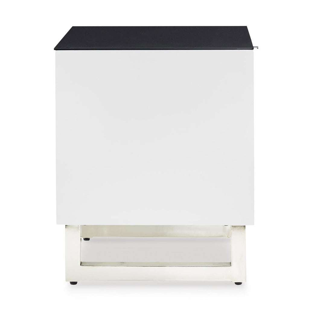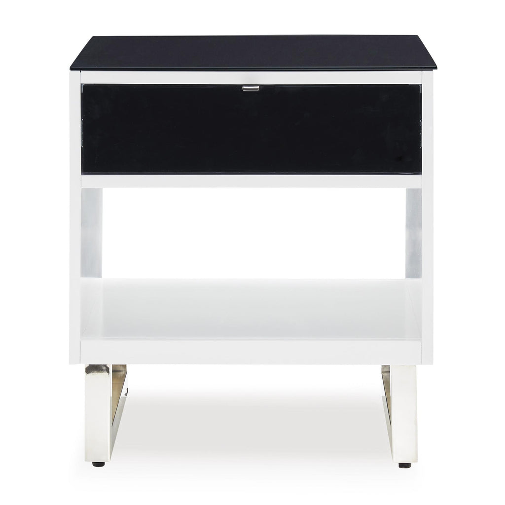 • Black glass tabletop; black acrylic laminate drawer front