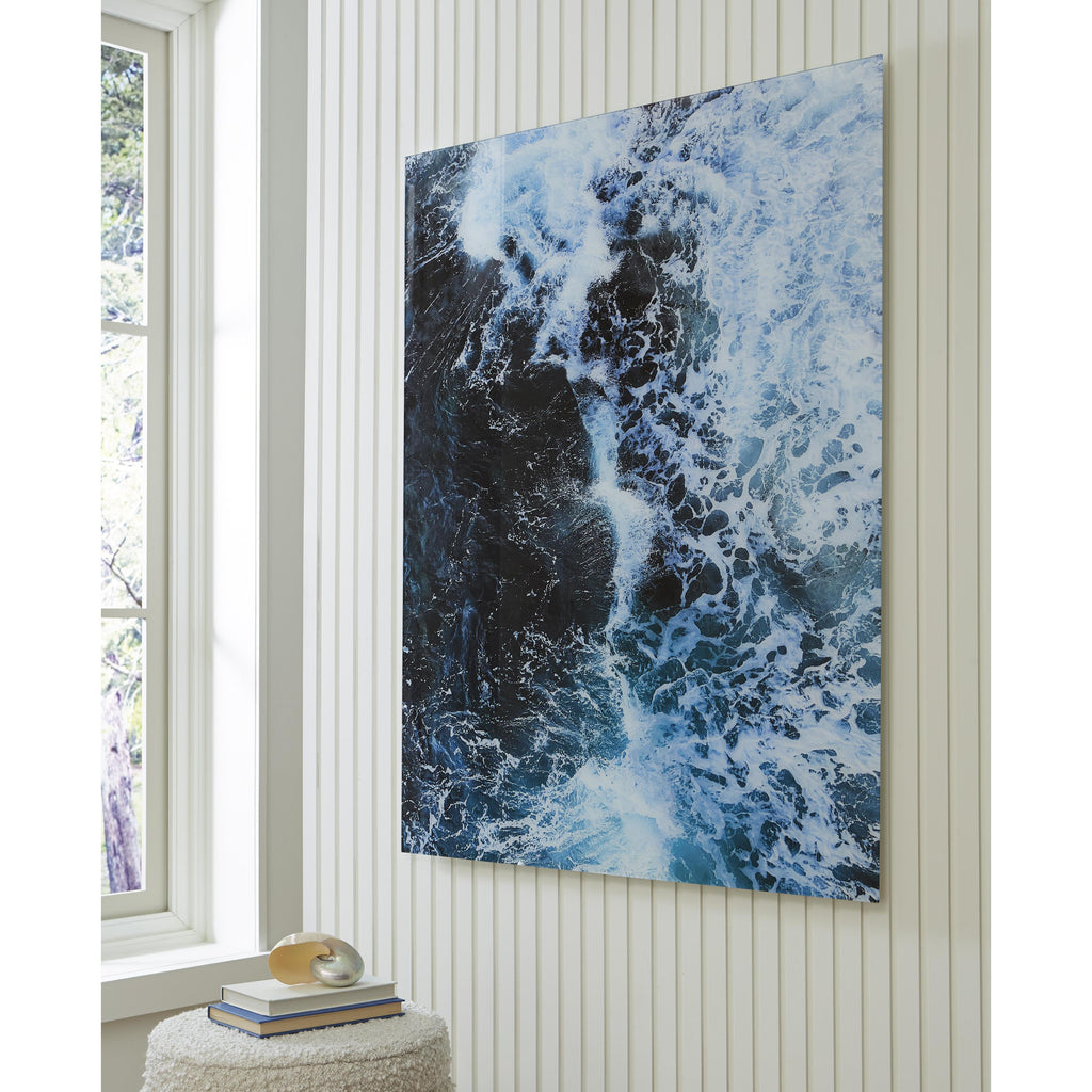 Like waves kissing the shoreline as they crash, this print on glass reminds you of the tide pulling out to... Like waves kissing the shoreline as they crash, this print on glass reminds you of the tide pulling out to sea. Swirling turquoise hues form a mesmerizing image of the ocean with foamy white caps. Perfect for ocean lovers or coastal cottages, this maritime art is sure to make a statement. View more