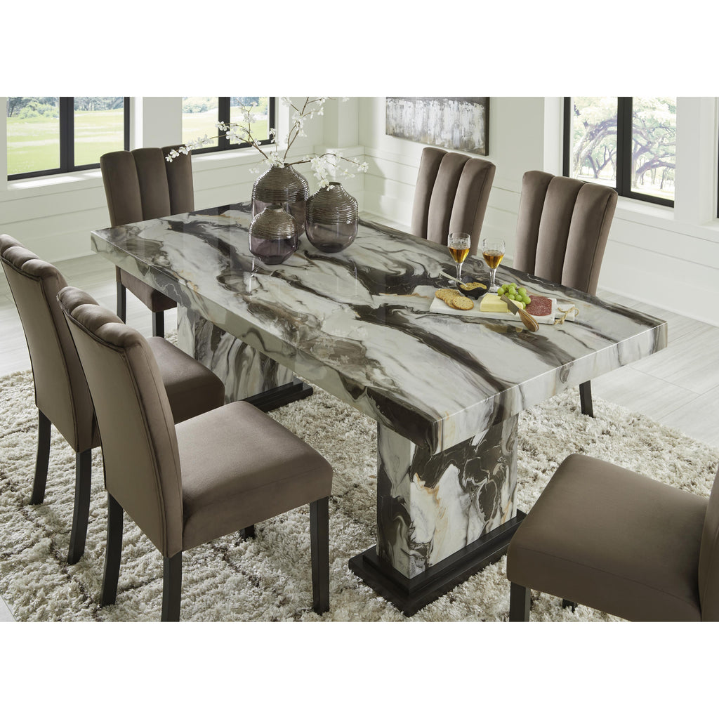 • Tabletop and double pedestal base with replicated marble pattern; polyester topcoat for lasting beauty