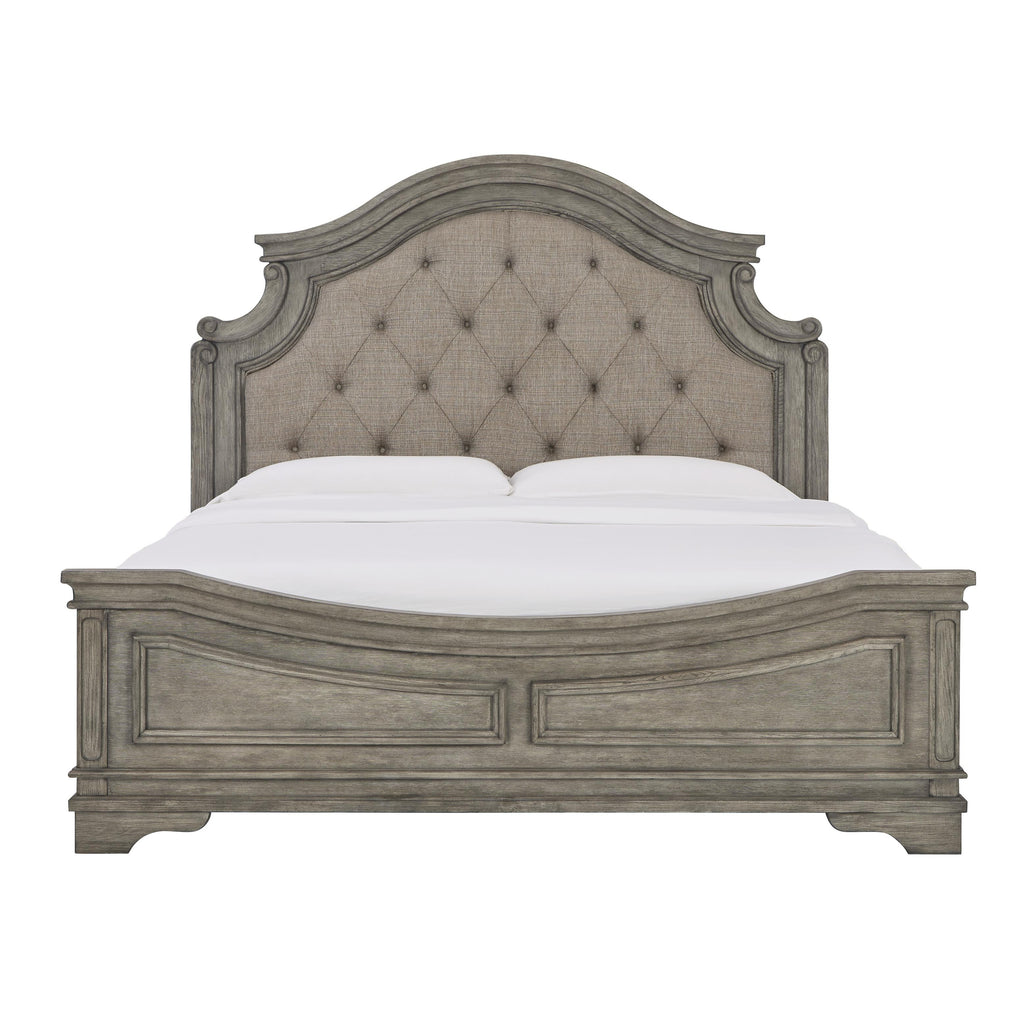 • Ornately shaped headboard with inset upholstered cushion