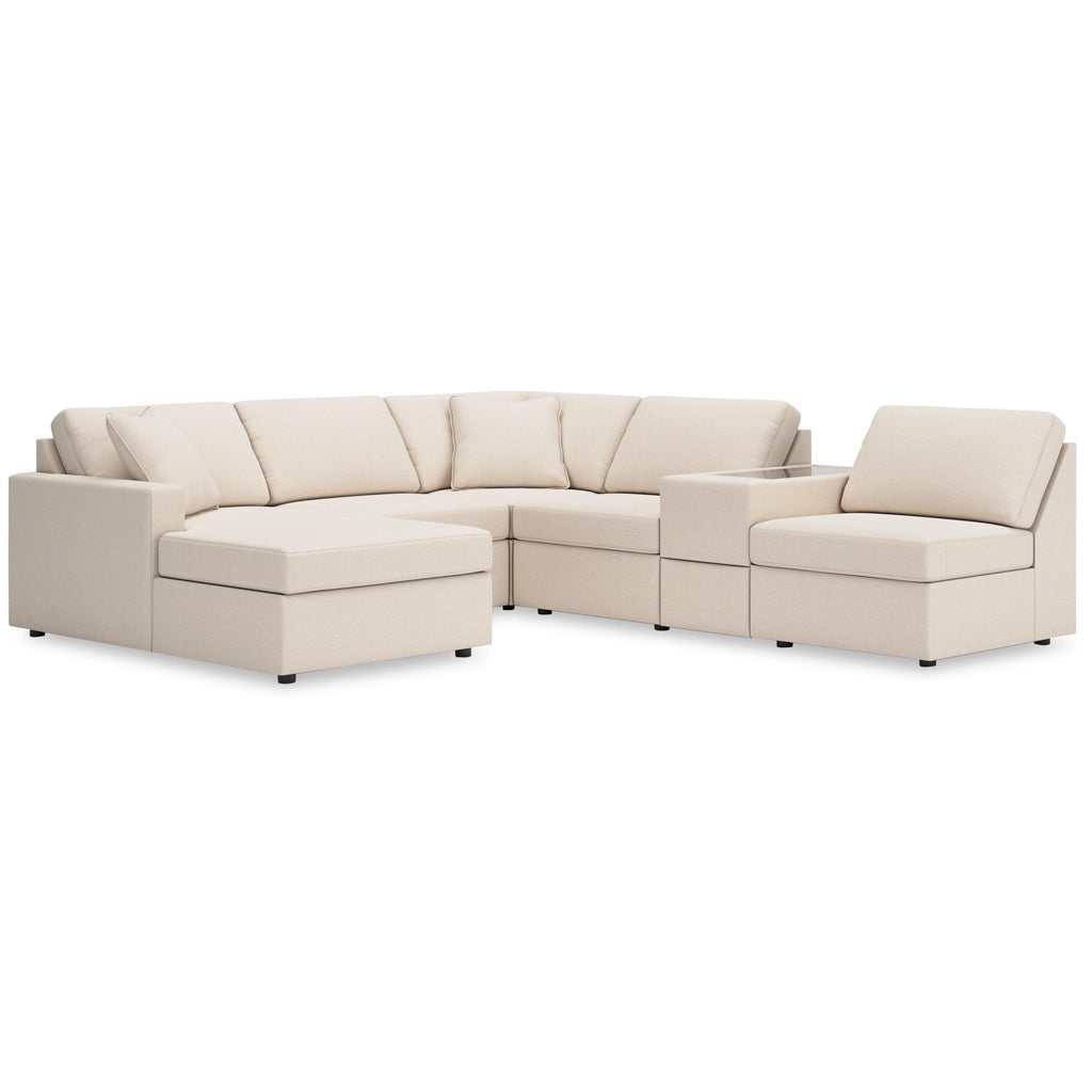 • Includes 6 modular pieces: left-arm facing corner chaise, 3 armless chairs, console with storage and wedge