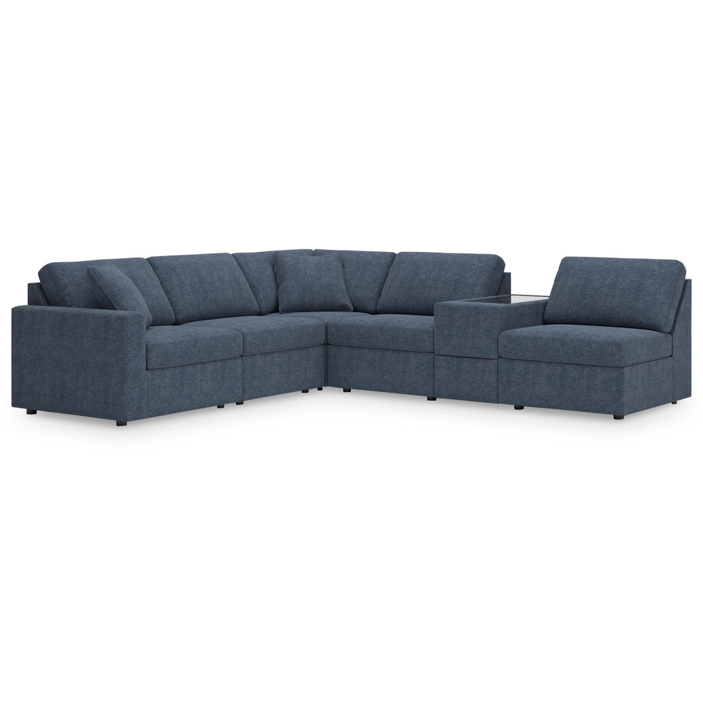 • Includes 6 modular pieces: left-arm facing corner chair, 3 armless chairs, wedge and console with storage