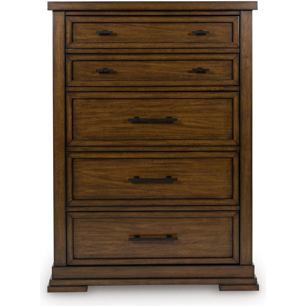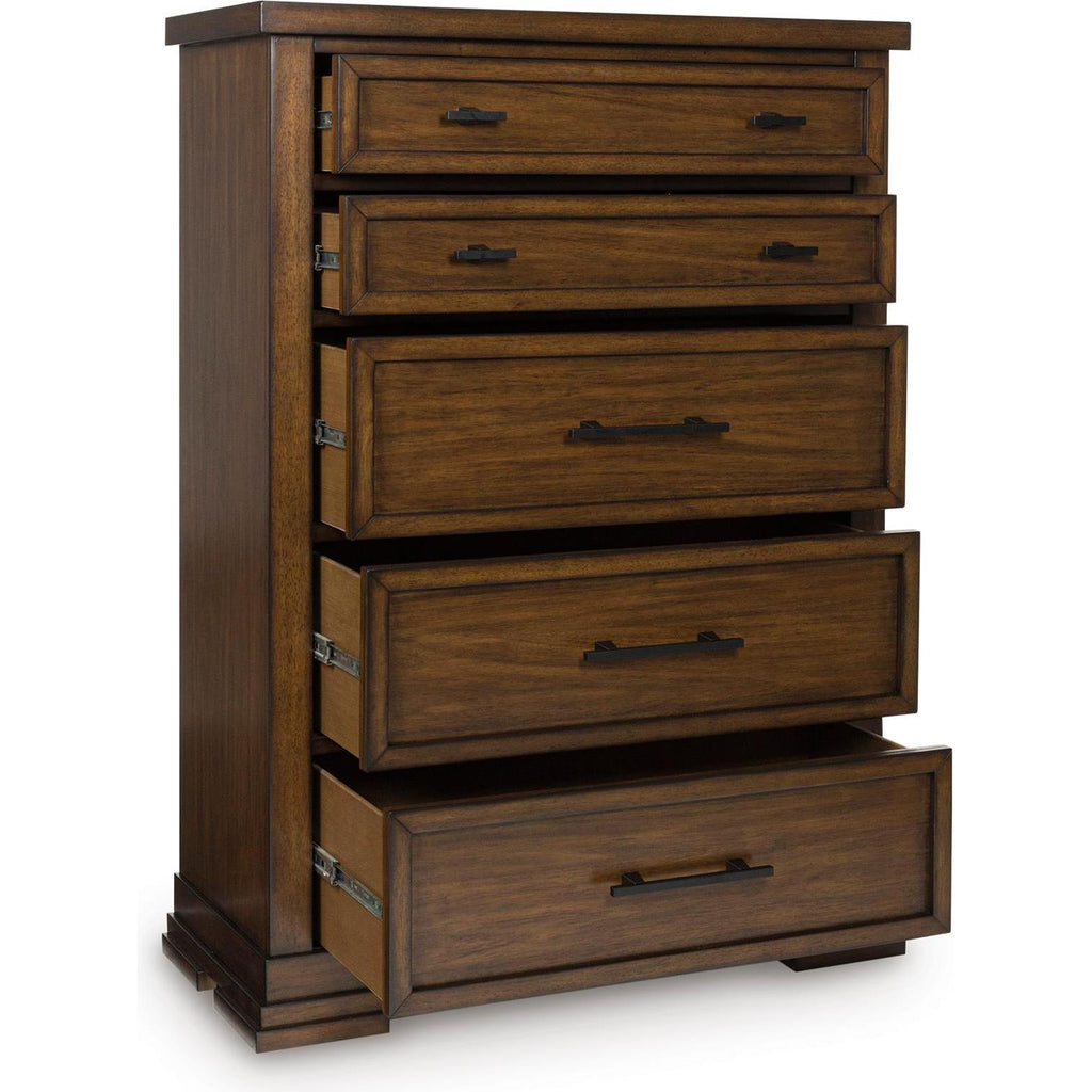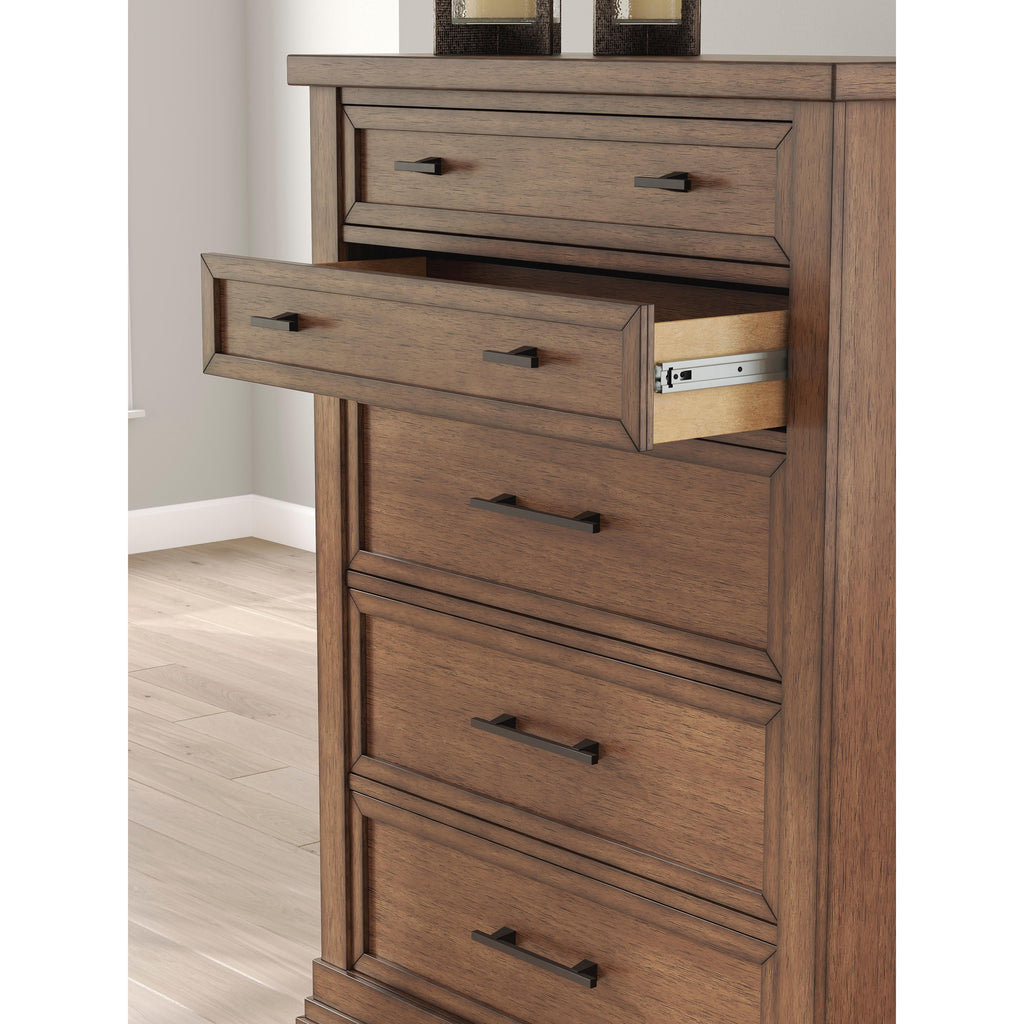 • 5 smooth-gliding drawers with fully finished interiors, French/English dovetail construction and heavy-duty ball-bearing side glides