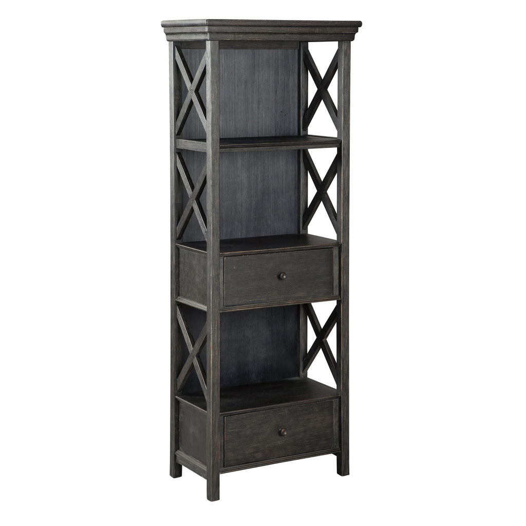• 2 floating drawers with antiqued bronze-tone knobs; top drawer lined