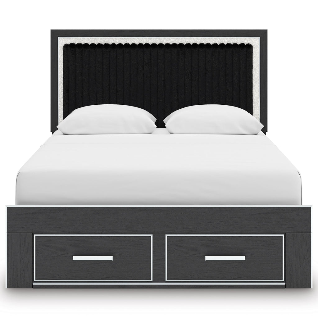 • Includes upholstered panel headboard, storage footboard, roll slats and platform rails